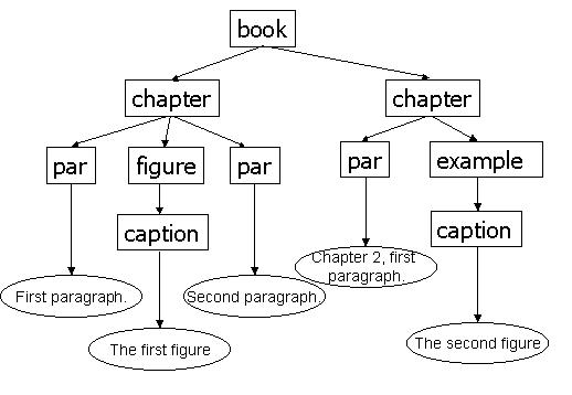 <!ELEMENT book (chapter+)> <!ELEMENT chapter (par|figure|example)+> <!ELEMENT par (#PCDATA|emph)*> <!ATTLIST par author CDATA #IMPLIED> <!ELEMENT figure (caption)> <!ATTLIST figure file CDATA #REQUIRED> <!ELEMENT example (caption)> <!ELEMENT caption (#PCDATA)>
